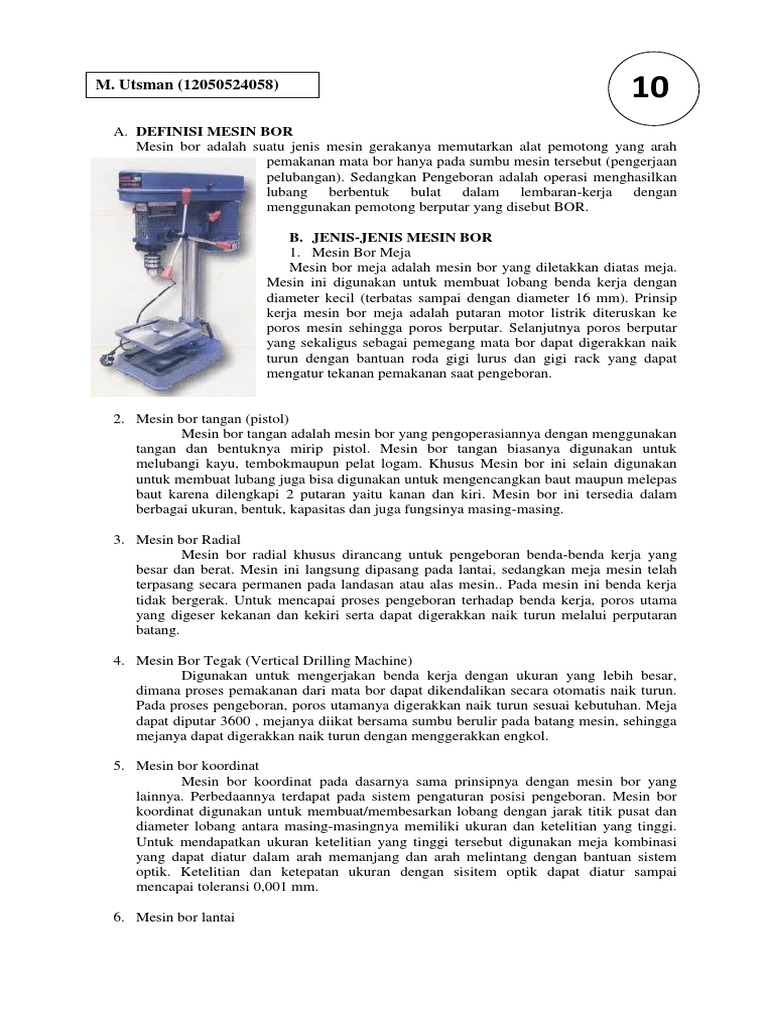 Mesin bor yang digunakan untuk melubangi benda kerja yang berat dan besar adalah. Vertical band saw b. Pada proses pengeboran poros utamanya digerakkan naik turun sesuai kebutuhan anda. Sebelum benda tersebut di ulir terlebih dahulu benda tersebut dilubangi dengan menggunakan mesin bor. Mesin bor lantai disebut juga mesin bor kolom.