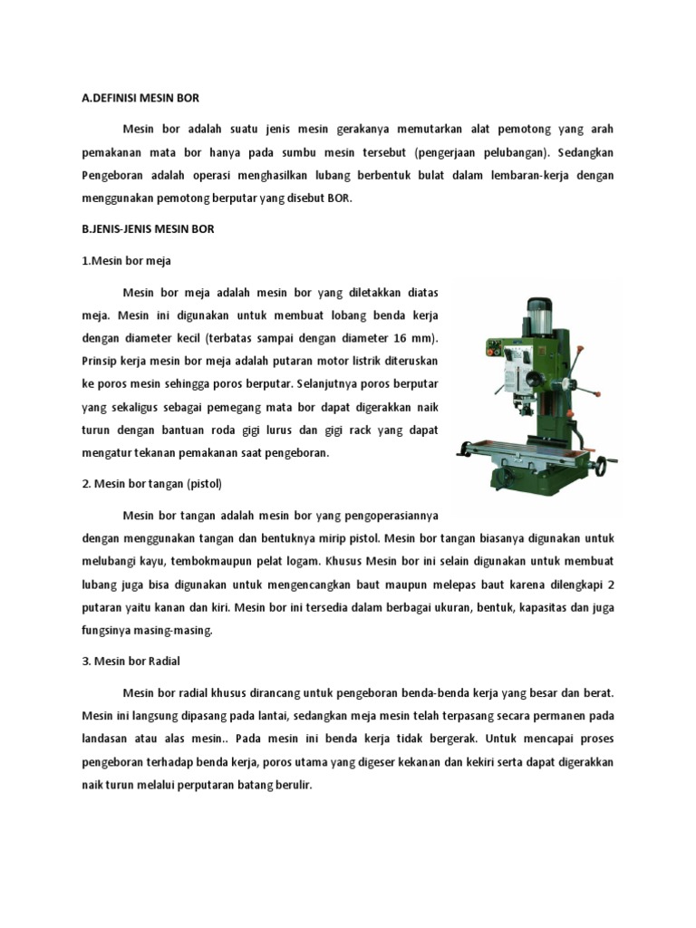 Mesin bor cordless adalah mesin bor tanpa kabel dimana bor ini menggunakan baterai sebagai sumber tenaganya. Bor berporos mesin bor jenis ini dipakai untuk melakukan sejumlah operasi secara sekaligus sehingga akan lebih cepat untuk melakukan produksi masal. Nah f ungsi utama dari mesin bor adalah untuk melubangi benda kerja dengan ukuran ukuran tertentu pengertian secara sederhana. Mesin guillotine sistem elektris.