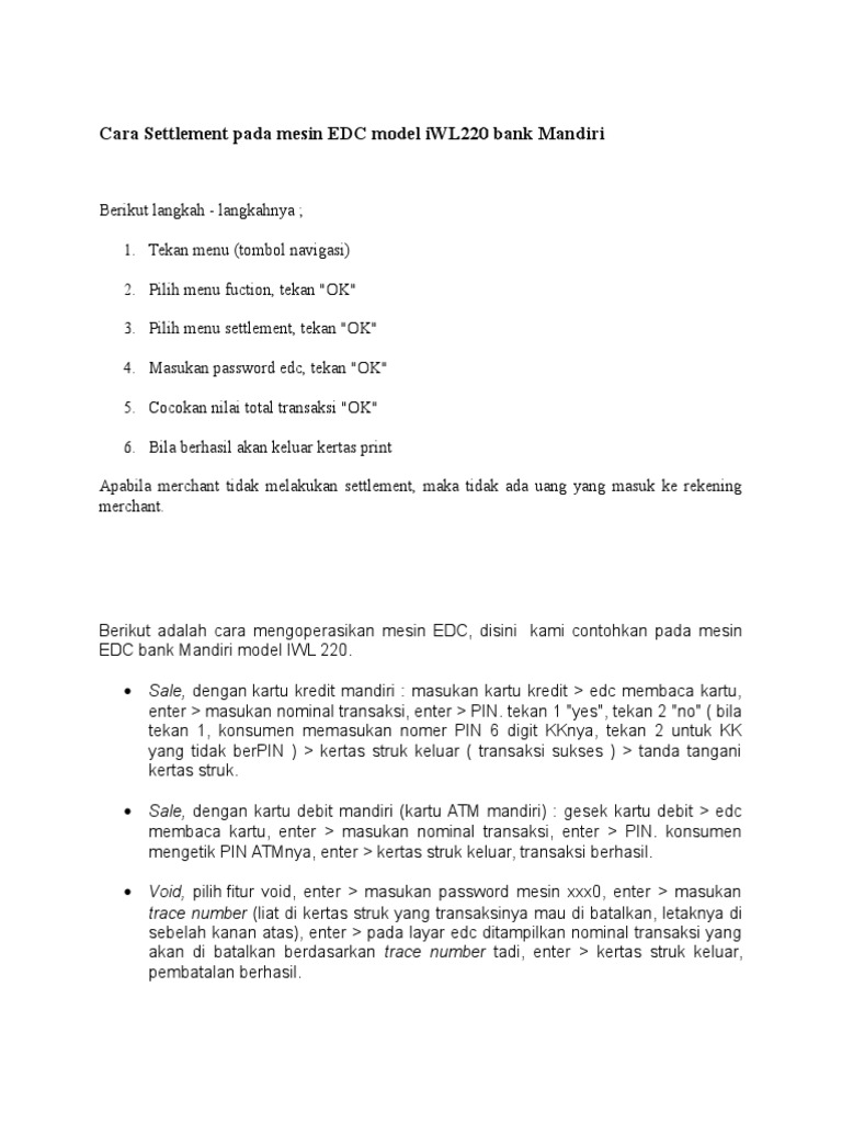 18 58 posting komentar ada tiga aplikasi yang sering digunakan di dalam penggunaan mesin edc model iwl220. Cara reprint settlement edc bca edc electronic data captured merupakan sebuah alat yang berguna sebagai media transaksi pembayaran cashless non tunai yang mungkin memudahkan bagi pembeli pasalnya mereka tidak perlu lagi menyiapkan uang cash dengan mesin edc kita juga bisa melakukan berbagai macam transaksi pembayaran virtual seperti bayar belanjaan dan lain lain. Tahun keempat sewa di bayar per bulan rp125 000. Pembayaran ke merchant pembayaran h 1 hari kalender setelah settlement pada akhir hari maksimal jam 22 00 wib tanpa pengendapan dana pengajuan edc tidak ada pengendapan dana di rekening.